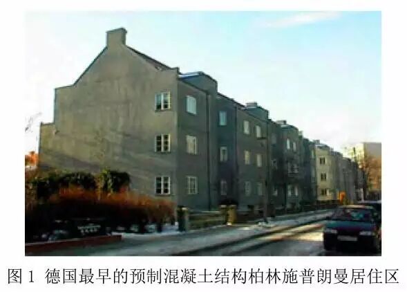德国最早的预制混凝土板式建筑是1926 ~1930年间在柏林利希藤伯格-弗里德希菲尔德(Berlin-Lichtenberg,Friedrichsfelde)建造的战争伤残军人住宅区。该项目共有138套住宅,为2~3层建筑。如今该项目的名称是施普朗曼(Splanemann)居住区。该项目采用现场预制混凝土多层复合板材构件,构件最大质量达7t。