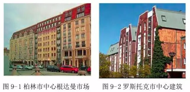住宅建设工程耗费了东德大量财政收入。 为节约建造成本和快速建设,设计开发出不同系列厂品,如Q3A,QX,QP,P2系列。预制混凝土大板住宅项目大量重复使用同样户型、类似的立面设计。大板建筑规划形态僵硬缺少变 化,在老城区通常采用推到重建模式,破坏了原有城市肌理。 大板建筑当时受到普遍欢迎,虽然大板建筑今天饱受诟病,但在当时大板住宅符合东德的社会意识形态,人人平等,整齐划一。预制混凝土大板技术建造的工业化住宅,功能基本合理,拥有现代化的采暖和生活热水系统,独立卫生间,比没有更新改造的20世纪初期建造的老住宅舒适。由于得到东德政府的大量财政补贴,因而这种工业化住宅租金不是很高,受到当地居民的欢迎。大量新建居住区,导致原有历史街区中的住宅吸引力下降,出租率低,租金无法支持建筑的维护,历史街区中的建筑逐渐破败。这种现象也导致政策制定者重新思考补贴政策,甚至开始尝试用预制技术进行老城历史建筑的改造更新。 上世纪80年代以后,东德政府开始在一 些城市的重要地区,尝试从规划和城市空间塑造方面,借鉴传统城市空间布局与建筑设计, 打破单调的大板建筑风格。 图9-1为柏林市中心根达曼市场 (Gendarmenmarkt),用复杂的预制大板技术建造具有传统风格的建筑。图9-2为罗斯托克市中心,带有传统红砖哥特风格的预制大板式建筑。