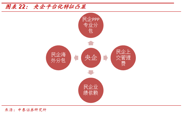 ■ 建筑央企往往作为总包,民企作为分包;或者建筑央企与民企合作成为项目投资牵头人,建筑央企起主导作用,获得总包资格,民企获得分包。许多地方政府项目只认央企,典型的情况是,民企因资质、背景原因难以承接项目时,会主动找央企做总包成为中间人,付给央企项目管理费。建筑民企普遍在寻求与央企的合作,许多民企业业绩亮点严重依赖于与建筑央企的合作。建筑央企平台化趋势日益显著,而这种行业地位和价值并没有在当前建筑央企的估值中得到体现。