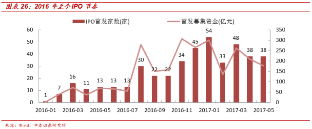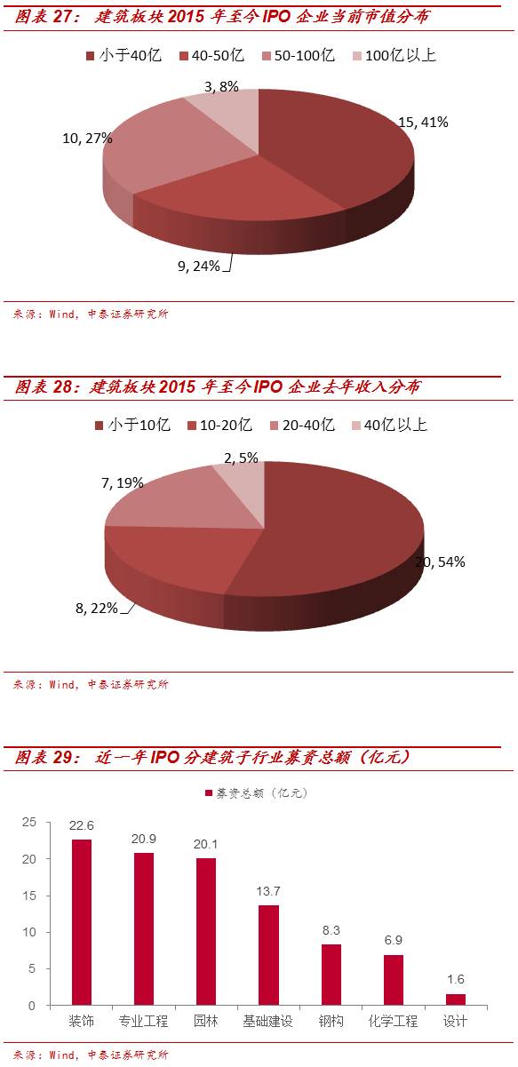 ■ 第三,随着IPO节奏加快,建筑行业新股不断增加,2015年至今建筑板块上市公司37家,当前市值超过100亿的仅3家,市值40亿以下占40%,2016年收入10亿以下占比为54%,集中在园林、装饰子版块,概括起来三句话:“更小的装饰公司、更小的园林公司、更小的设计公司”,同质化程度极高而数量众多,许多公司刚上市就面临主业下滑谋求转型。