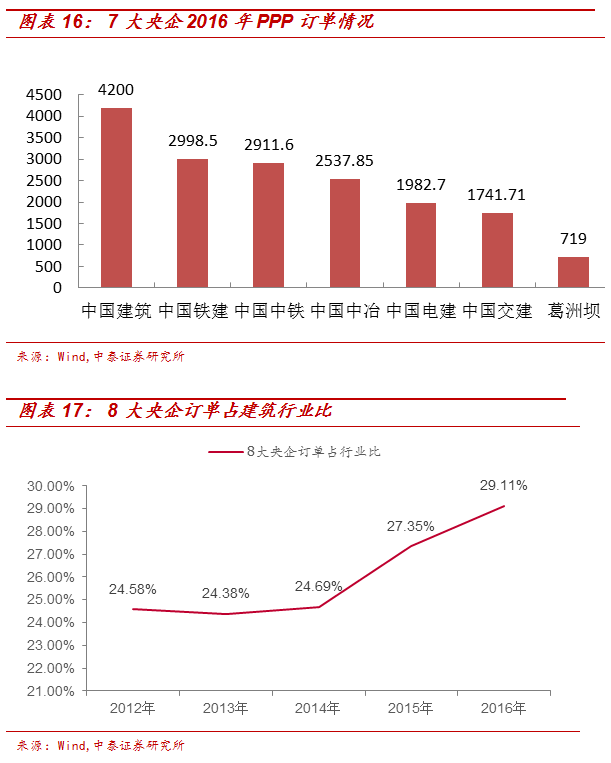 ■ 基建类订单正加速向大型央企集中,央企与地方政府间上千亿框架协议频频出现。以中国建筑为例,截止至2016年末公司累计签约135个PPP项目,投资总额5300多亿元,带动施工3000多亿,权益投资额2200多亿,所承接的PPP项目个数占全国的11%,投资总额占23%,彰显绝对龙头地位。其他诸如中铁、铁建等中标PPP金额均在2000亿以上。据粗略统计七大建筑央企合计中标PPP订单在1.7万亿左右,占总落地PPP项目的50%。借助PPP推广大潮,央企新签订单占行业总订单比也在2014年起快速提升,2016年8大央企订单占比已达29.11%。