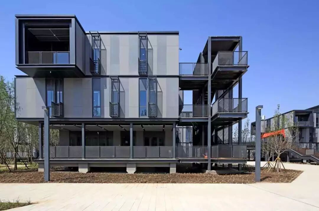 企业办公区采用了全装配化、集成化的集装箱式建造技术,装配化率达80%-90%。办公楼与酒店设计以4m×12m的集装箱作为基本单位,适合运输,便于灵活组合。办公基本单元为1000~1200㎡左右的“十字”单元组合。单元布局组合灵活,可生长性强,适于根据发展需求变化。