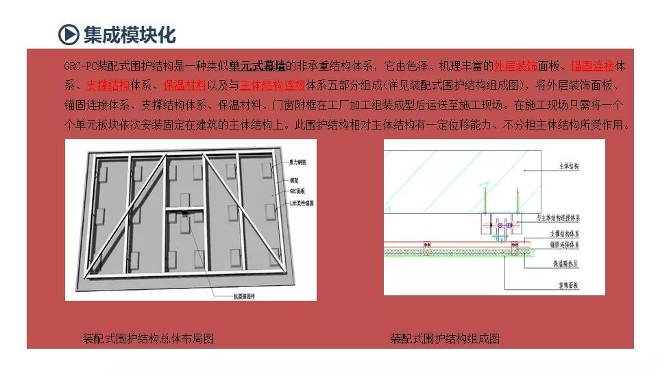 其次,讲到材简约模块化(复杂的表皮用简单的模块化实现)介绍了集成模块化GRC-PC