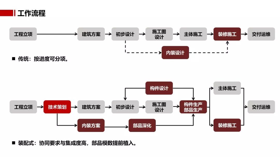 首先,王总指出装配式结构+装配式装修=装配式建筑的观点,将传统装修与装配式装修进行了鲜明的对比。 设计对比: