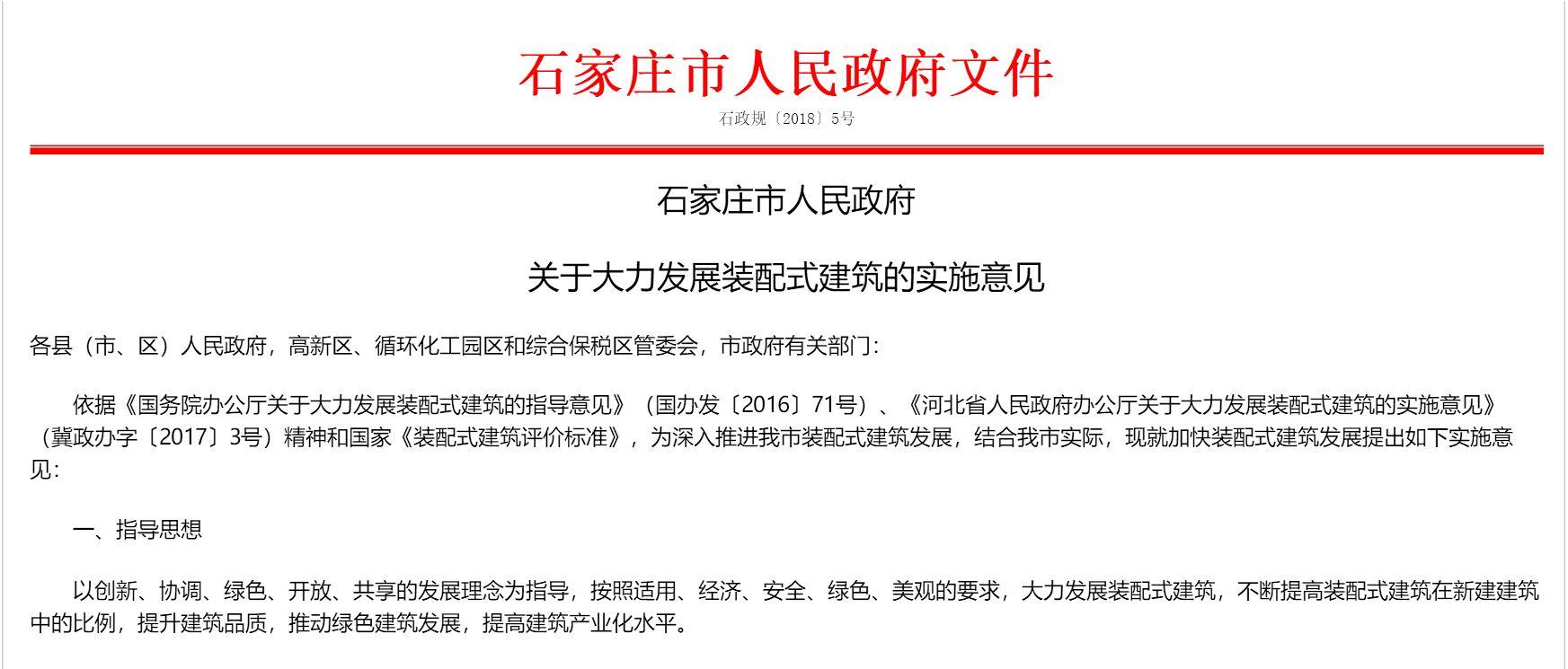 近日,新浪乐居从石家庄市人民政府网站获悉《石家庄市人民政府关于大力发展装配式建筑的实施意见》(以下简称《意见》)。《意见》指出,要大力发展装配式建筑,不断提高装配式建筑在新建建筑中的比例,提升建筑品质,推动绿色建筑发展,提高建筑产业化水平,要求到2025年,桥西区、裕华区、长安区、新华区新建建筑凡适合装配式方式建造的,全部采用装配式建造。以下为《意见》全文: